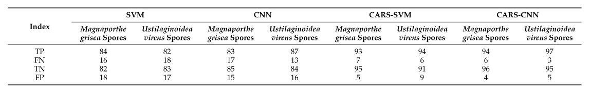 表1和表2分別展示了不同模型的分類結(jié)果以及分類指標(biāo)結(jié)果。以CARS篩選后的波段為變量的分類模型優(yōu)于以全波段為變量的分類模型。通過比較CARS-SVM和CARS-CNN分類模型,發(fā)現(xiàn)兩種模型對稻瘟菌孢子的分類結(jié)果相似。而CARS-CNN模型對于稻綠核菌孢子的分類結(jié)果中,其二級指標(biāo)中的準確率、精確率、召回率和特異性分別為0.960、0.950、0.970和0.950,三級指標(biāo)的F1得分為0.960,遠高于CARS-SVM分類模型。F1得分越接近1,說明分類效果越好。因此,CARS-CNN分類模型在稻綠核菌孢子分類中更有優(yōu)勢。