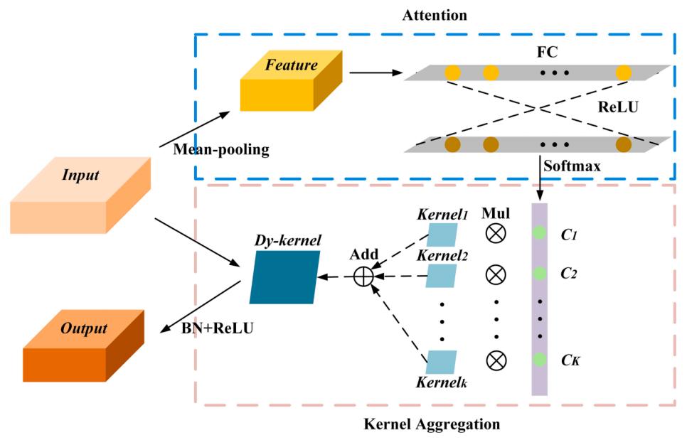 與傳統(tǒng)機器學(xué)習(xí)相比,深度學(xué)習(xí)具有端到端特征,避免了復(fù)雜的特征工程。代表性的模型是卷積神經(jīng)網(wǎng)絡(luò)(Convolutional neural networks, CNN)和殘差網(wǎng)絡(luò)(Residual networks, ResNet)。利用ResNet中提出的殘差連接直接連接不同的網(wǎng)絡(luò)層,在保證良好網(wǎng)絡(luò)性能的同時可以加深網(wǎng)絡(luò)。然而,當(dāng)CNN或ResNet的深度和寬度固定時,由于卷積核不容易根據(jù)實際數(shù)據(jù)的特點進(jìn)行有效調(diào)整,其表示能力將受到限制。動態(tài)卷積是在靜態(tài)卷積的基礎(chǔ)上改進(jìn)的非線性運算。它可以解決深度學(xué)習(xí)模型適應(yīng)性差的問題,更有效地提取數(shù)據(jù)特征。同時,動態(tài)卷積計算是高效的,因為并行卷積核通過聚合共享輸出通道,這不會增加網(wǎng)絡(luò)的深度和寬度。在網(wǎng)絡(luò)中引入動態(tài)卷積可以在特征識別過程中自適應(yīng)捕獲特征。