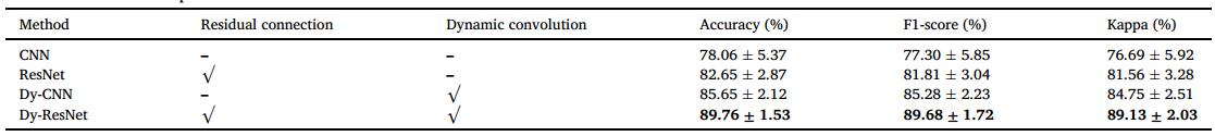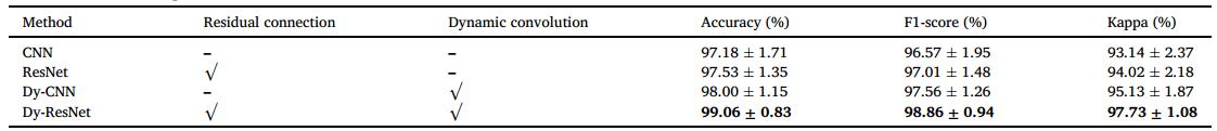 為了進(jìn)一步驗證Dy-ResNet在塑料識別中的有效性,分別使用Dy-ResNet、ResNet、Dy-CNN和CNN模型對17種樣品進(jìn)行分類。4個模型在全連接層的輸出神經(jīng)元數(shù)量從2個變?yōu)?7個,4個模型的其他結(jié)構(gòu)和超參數(shù)不變。17種塑料的分類結(jié)果見表2。總體而言,DyResNet的分類性能優(yōu)于其他模型,其準(zhǔn)確率為89.76%,F(xiàn)1-score為89.68%,Kappa為89.13%。與CNN相比,Dy-ResNet中的殘差連接可以有效提取塑料高光譜圖像的深層特征。在5個獨立實驗中,Dy-ResNet的模型精度最高,表明其具有*好的識別穩(wěn)定性。殘差連接和動態(tài)卷積層的引入可以有效地提高模型的穩(wěn)定性。