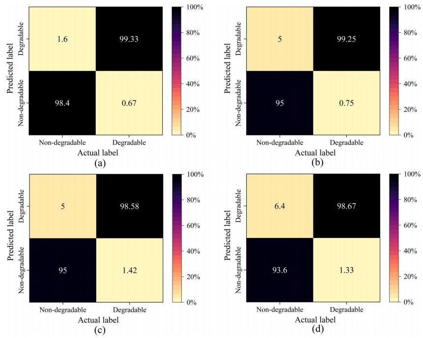 圖6 四種方法對可降解塑料和不可降解塑料的分類結(jié)果。Dy-ResNet(a), Dy-CNN(b), ResNet(c), CNN(d)