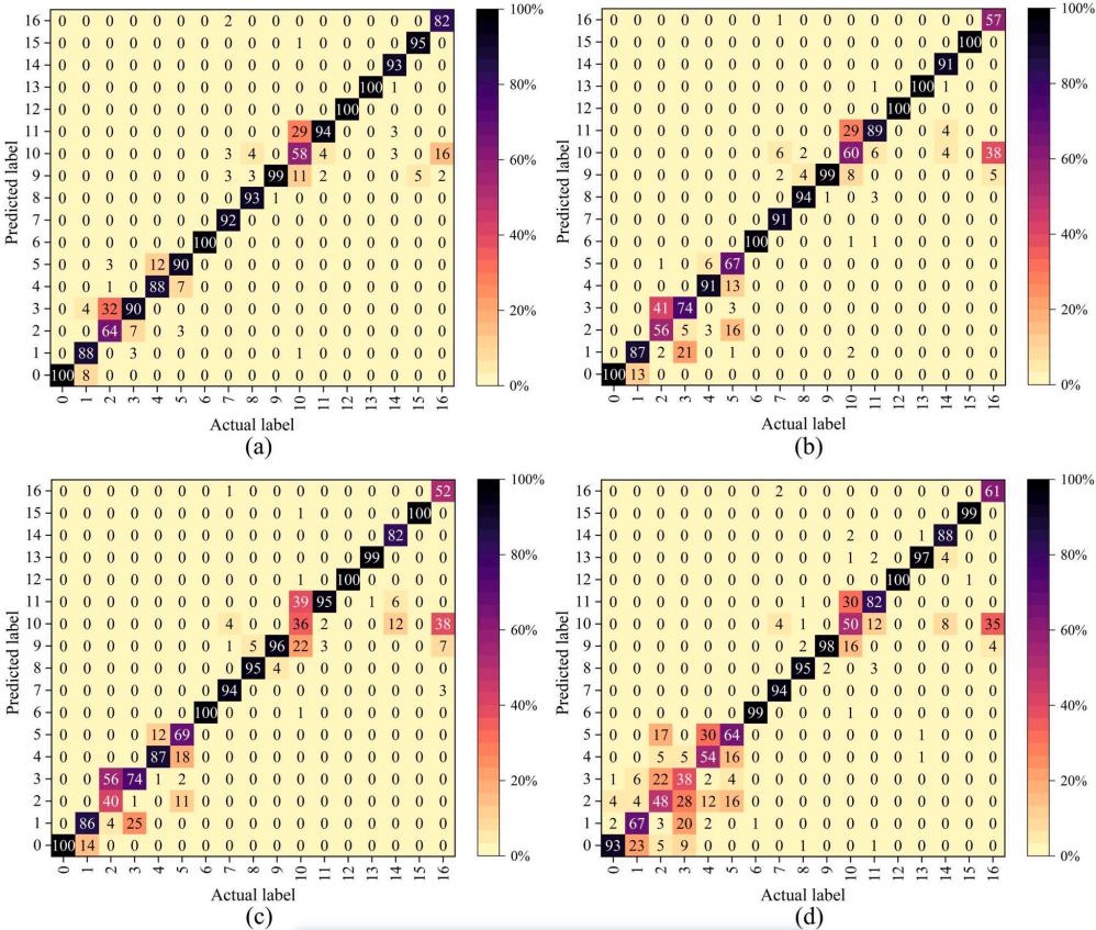 圖7 四種方法對17種塑料的分類結(jié)果。Dy-ResNet(a), Dy-CNN(b), ResNet(c), CNN(d)
