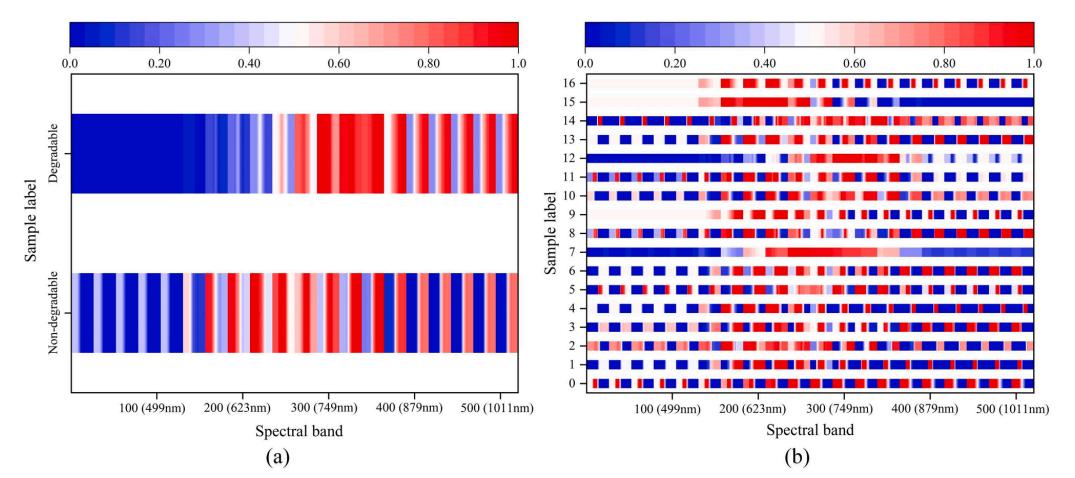 圖8 用于塑料識別的特征光譜可視化。2分類實驗(a), 17分類實驗(b)