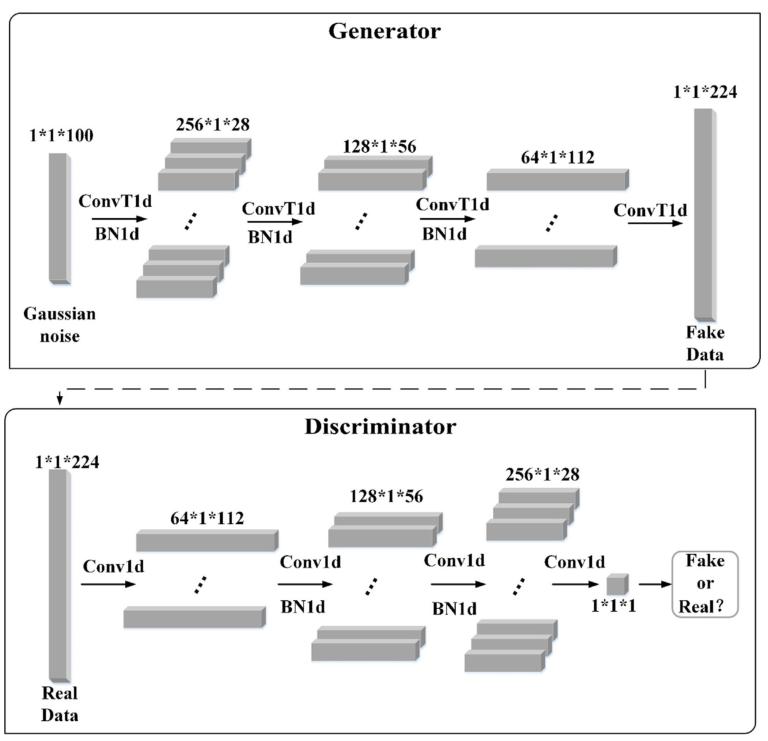 GAN是由生成器(Generator)和判別器(Discriminator)兩個部分組成(圖2)。生成器接收隨機噪聲,通過生成模型生成假樣本。判別器的輸入是一個樣本,判別網(wǎng)絡判斷輸入樣本是來自于真實樣本還是生成器生成的假樣本。通過不斷訓練,生成器最終生成盡可能真實的數(shù)據(jù)。本研究采用DCGAN作為增強數(shù)據(jù)的方法。DCGAN主要的改進是在網(wǎng)絡結構上,生成器和判別器中均使用了一個卷積神經(jīng)網(wǎng)絡,同時改進了卷積神經(jīng)網(wǎng)絡部分結構(圖3)。