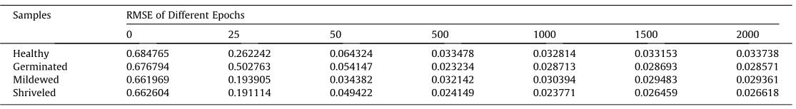 表1 不同epoch下小麥籽粒實測數(shù)據(jù)與生成數(shù)據(jù)的均方根誤差