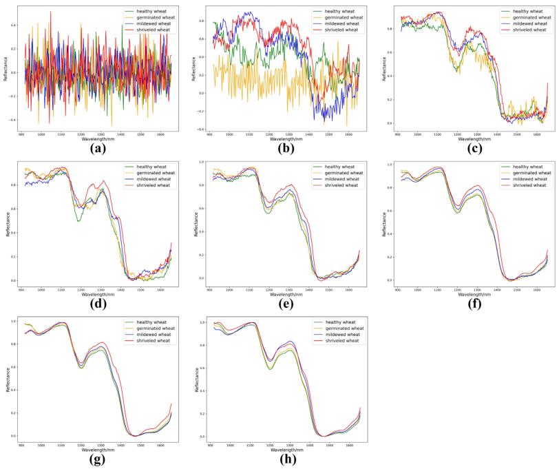 從圖4可以看出,4種小麥籽粒的光譜特征相似,萎蔫籽粒的平均光譜反射率顯著高于其他3種,健康籽粒的光譜反射率值差異*大。霉變小麥籽粒受到真菌侵染的影響,籽粒表面顏色和形狀發(fā)生變化,但對含水率影響不大。因此,與萎蔫小麥籽粒相比,其光譜反射率值接近健康籽粒。萌發(fā)籽粒與健康籽粒不同,因為其萌發(fā)需要消耗能量。但與其他兩種籽粒相比,其光譜反射率值最接近健康小麥籽粒。在1150 ~ 1300 nm和1400 ~ 1650 nm兩處波段的差異為后續(xù)分類算法的建立提供了基礎。