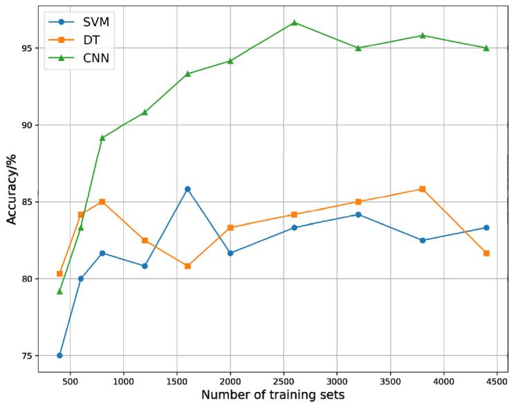 圖8 不同分類器的分類精度隨訓練集數(shù)據(jù)的增加而變化