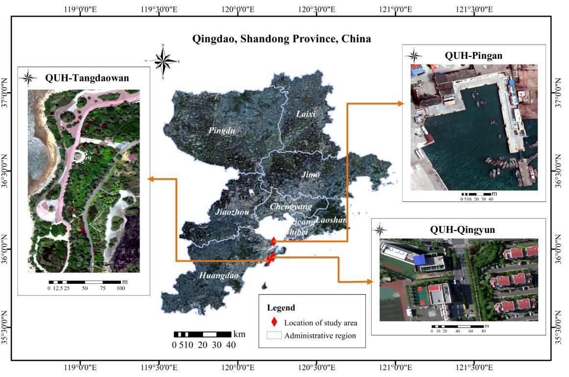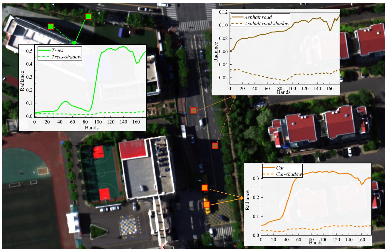 中國石油大學(xué)孫根云教授團(tuán)隊(duì)選取了位于中國山東省青島市西海岸新區(qū)的三個(gè)研究區(qū)(圖1)。在此研究中構(gòu)建了具有高分類挑戰(zhàn)的QUH數(shù)據(jù)集。QUH數(shù)據(jù)集包含三個(gè)子數(shù)據(jù)集,即QUH-唐島灣、QUH-青云和QUH-平安,均由安裝在無人機(jī)平臺(tái)上的高光譜傳感器Gaiasky mini2-VN成像光譜儀(江蘇雙利合譜科技有限公司)獲取,規(guī)格如圖2所示。三個(gè)數(shù)據(jù)集的詳細(xì)飛行參數(shù)信息如表1所示。QUH-唐島灣、QUH-青云、QUH-平安數(shù)據(jù)集詳細(xì)的土地覆蓋分布及相應(yīng)的光譜曲線分別如圖3和圖4、圖5和圖6、圖8和圖9所示。然而,QUH-青云數(shù)據(jù)集的某些區(qū)域被建筑物陰影遮擋,包括樹木、汽車和瀝青道路等類別(圖7)。