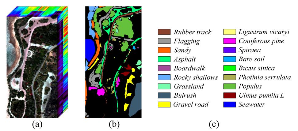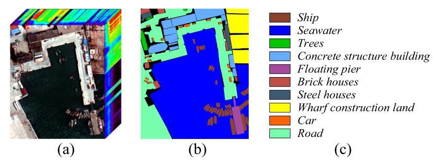 圖 3.:QUH-唐島灣數(shù)據(jù)集。(a) 圖像立方體,(b) 地面實(shí)況圖像,(c) 土地覆蓋類別