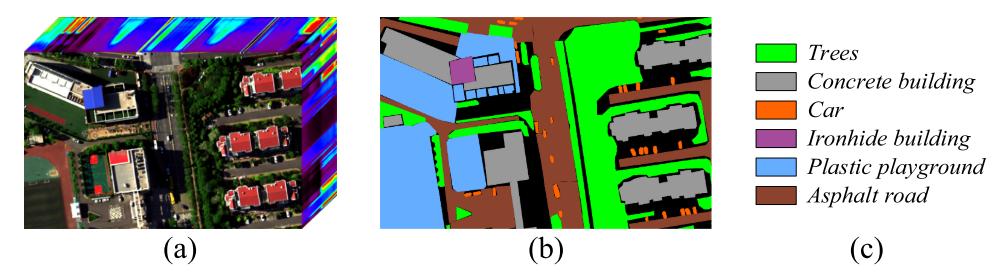 圖 5:QUH-青云數(shù)據(jù)集。(a) 圖像立方體,(b) 地面實(shí)況圖像,(c) 土地覆蓋類別