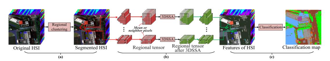 圖 11:用于 HSI 分類的 RC-3DSSA 流程圖,包括三個(gè)步驟:(a) 基于 RC 的 HSI 分割,(b) 每個(gè)區(qū)域的 3DSSA,以及 (c) 基于 SVM 的分類