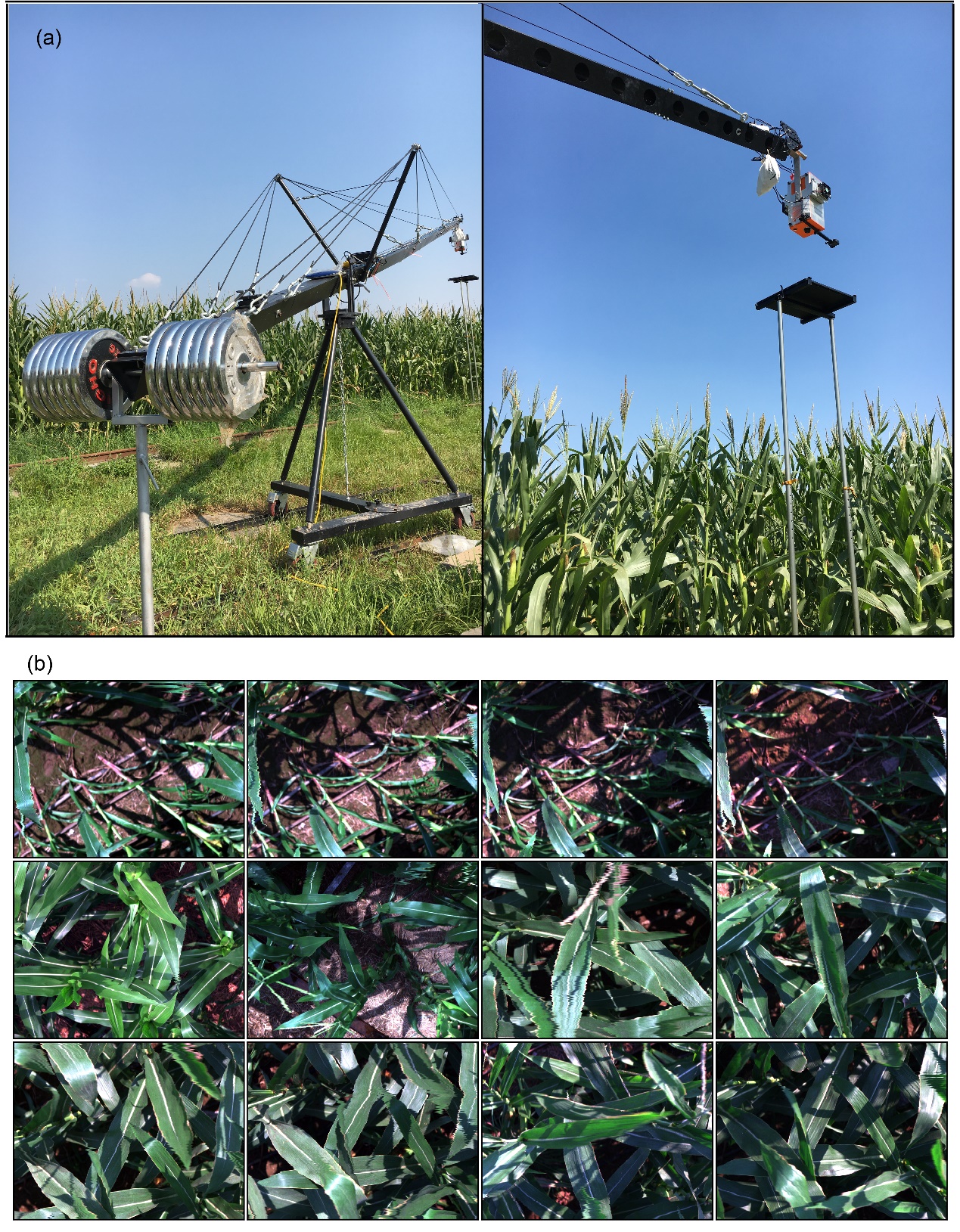 圖1近地面高分辨率成像數(shù)據(jù)集的觀測系統(tǒng)的現(xiàn)場照片和植被成像光譜數(shù)據(jù)實例。(a)光譜相機(jī)GaiaField-F-V10安裝在固定的軌道臂上,并提升到距離冠層頂部約2米的高度。(b)不同光照條件下的真彩色合成影像示例,按低(第一行)、中(第二行)和高(第三行)覆蓋度進(jìn)行分類。