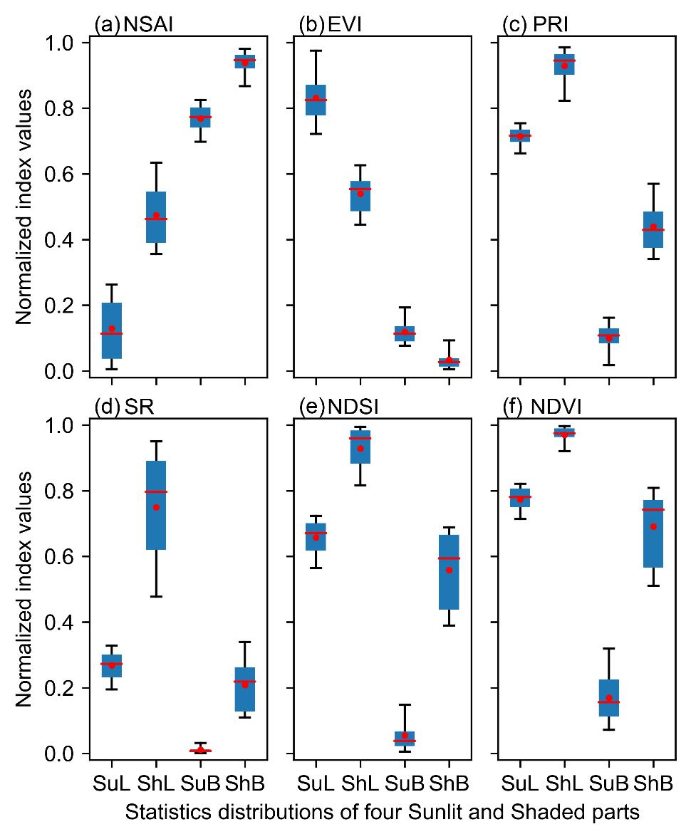 圖2陽葉(SuL)、陰葉(ShL)、光照背景(SuB)和陰影背景(ShB)的6個光譜指數(shù)的箱形圖:不同光譜指數(shù)都?xì)w一化到0~1的范圍。紅色點表示指數(shù)均值,紅色線表示中位數(shù),藍(lán)色框表示[25%,75%]百分位數(shù),黑色須分別表示5%和95%百分位數(shù)。以上統(tǒng)計特征值根據(jù)高分辨率影像數(shù)據(jù)的監(jiān)督分類結(jié)果計算獲得。