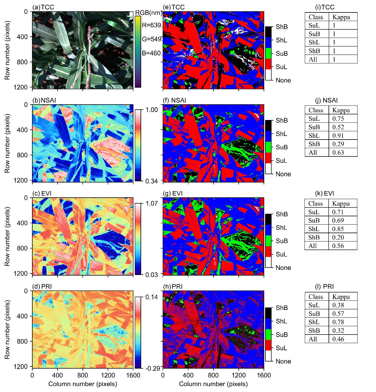 圖3陽葉(SuL)、陰葉(ShL)、光照背景(SuB)和陰影背景(ShB)的高分辨率影像分類結(jié)果圖,(a)高分辨率成像數(shù)據(jù)的真彩色合成圖(TCC),(b-d) NSAI、EVI和PRI指數(shù)圖像,(e)高分辨率圖像的監(jiān)督分類結(jié)果,(f-h)分別基于NSAI、EVI和PRI指數(shù)圖像的非監(jiān)督分類結(jié)果,(i-l)非監(jiān)督分類結(jié)果和參考值(即監(jiān)督分類結(jié)果,假設(shè)監(jiān)督分類結(jié)果代表真實值)的kappa系數(shù)。