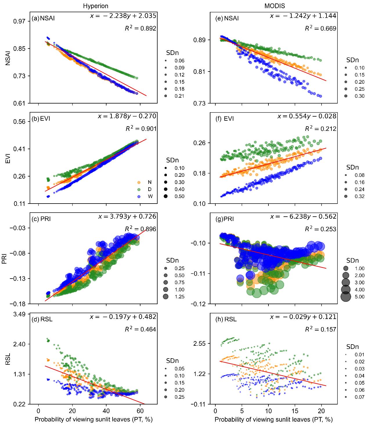 圖4模擬的Hyperion(a-d)和MODIS(e-h)場景下,NSAI、EVI、PRI和RSL(紅波段上冠層反射率與葉片反射率的比值)指數(shù)與PT的相關(guān)性,點的顏色表示不同土壤類型:正常土壤(N,橙色點)、干土壤(D,綠色點)、濕土壤(W,藍(lán)色點)。Hyperion樣本數(shù)量為13,950,144個,其中模擬場景數(shù)量為10,764;MODIS樣本數(shù)量為3,732,480個,模擬場景數(shù)為2,880個;每個點代表432個具有不同葉片光譜和相同PT的樣本的平均值,點的半徑為具有相同PT的432個樣本中對應(yīng)指數(shù)的歸一化標(biāo)準(zhǔn)差SDn值。