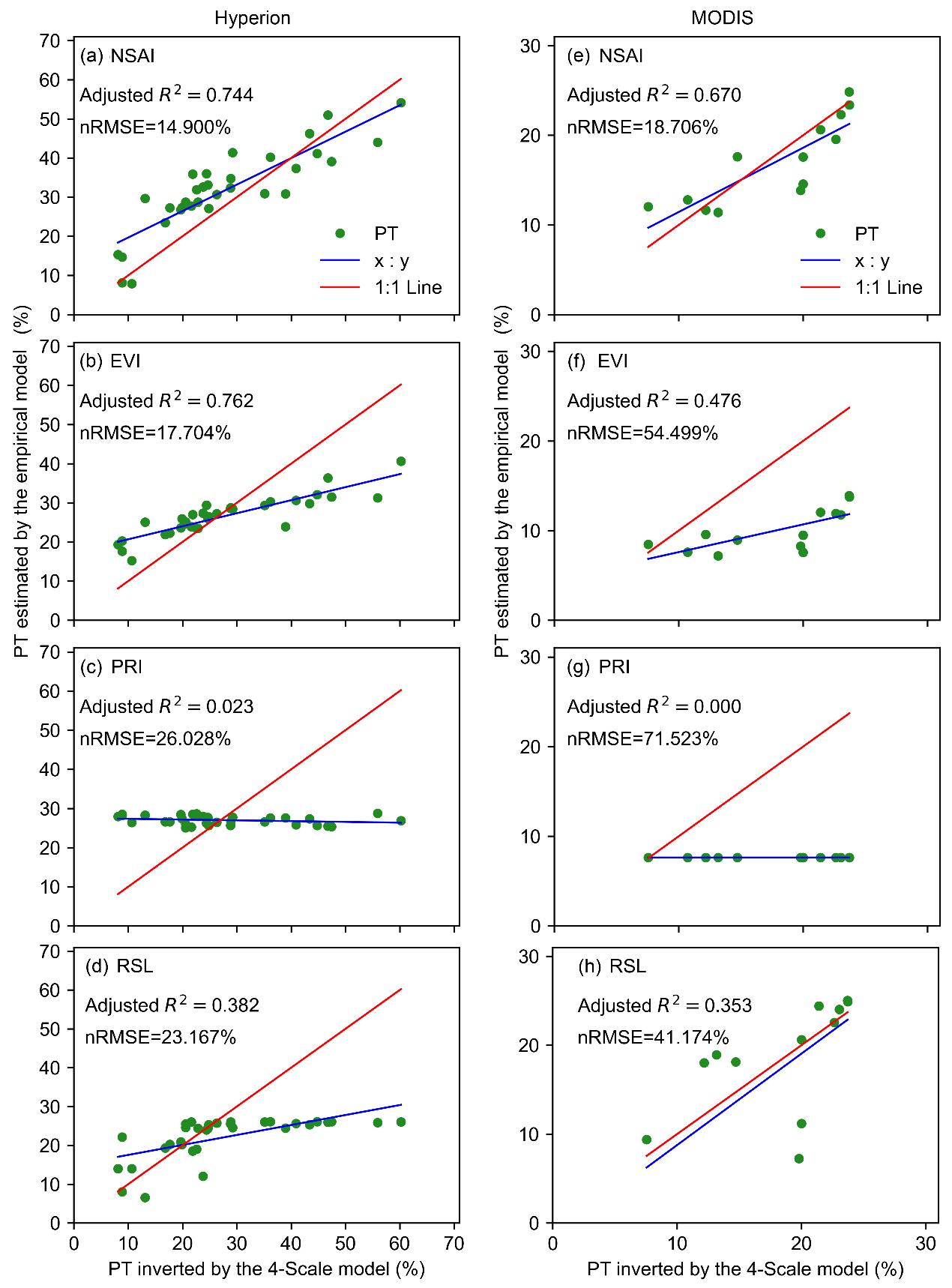 將利用模擬數(shù)據(jù)校準(zhǔn)的基于NSAI的PT估算模型應(yīng)用于高光譜-高空間分辨率的Hyperion數(shù)據(jù)時,估計的PT的歸一化均方根誤差(nRMSE)和調(diào)整R2分別為14.9%和0.744。應(yīng)用于中分辨率的MODIS影像時,PT的估計精度也非常令人滿意,nRMSE為18.71%,調(diào)整R2為0.67(圖5)。表明NSAI有巨大希望應(yīng)用于衛(wèi)星影像直接估算PT,提高植被參數(shù)的反演精度。