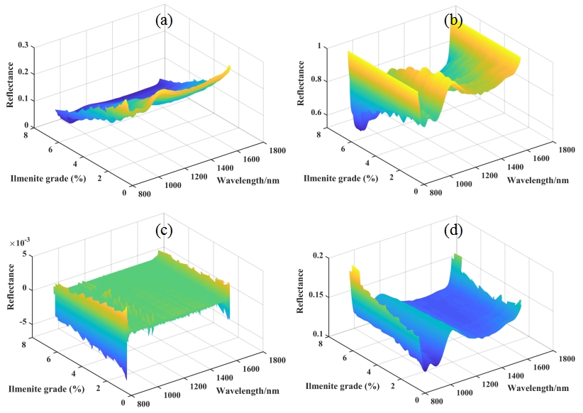 鈦鐵礦樣本的光譜反射率值在0.03 - 0.27之間,證實粉狀鈦鐵礦的整體反射率較低,并隨品位的增加而降低。圖1b顯示在NIR區(qū)域,該鈦鐵礦的光譜特征分別在940nm、1020nm和1300~1650nm處出現(xiàn)了波谷。具體地,光譜反射率值在940 nm處達到谷值,隨后急劇下降,這主要歸因于O-Ti-O的拉伸和變形。該鈦鐵礦較寬的吸收波段主要位于1300 ~ 1650 nm,Izawa指出這是由八面體配位的亞鐵在此附近產(chǎn)生晶體場躍遷分裂而引起的。