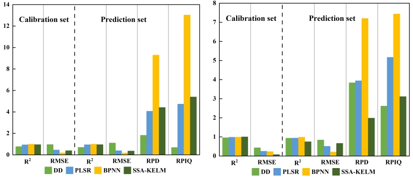 采用SG、MSC、CR、SD、MSC+SG等5種預處理方法對原始光譜數(shù)據(jù)進行處理?;贒D模型對比原始光譜數(shù)據(jù),探索出HSI光譜數(shù)據(jù)的***預處理方法,結(jié)果如表2所示。預測集中,與原始數(shù)據(jù)相比,MSC+SG方法下的各指標R2P提高了5.88%,RMSEP降低了34.39%,RPD和RPIQ分別提高了28.86%和38.93%。