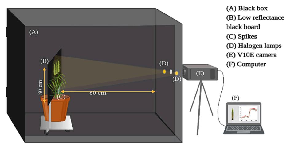 南京農(nóng)業(yè)大學(xué)智慧農(nóng)業(yè)創(chuàng)新團(tuán)隊(duì)以小麥赤霉病為研究對(duì)象,在南京農(nóng)業(yè)大學(xué)牌樓試驗(yàn)基地開(kāi)連續(xù)三年展了小麥赤霉病監(jiān)測(cè)試驗(yàn),利用了兩個(gè)高抗小麥品種和一個(gè)易感小麥品種,在穗部接種赤霉菌后開(kāi)始持續(xù)觀測(cè)。利用我司高光譜設(shè)備(V10E近紅外高光譜成像儀)進(jìn)行穗部時(shí)序拍照(圖1),并同步進(jìn)行破壞性取樣測(cè)試穗子的多項(xiàng)生理生化指標(biāo)。