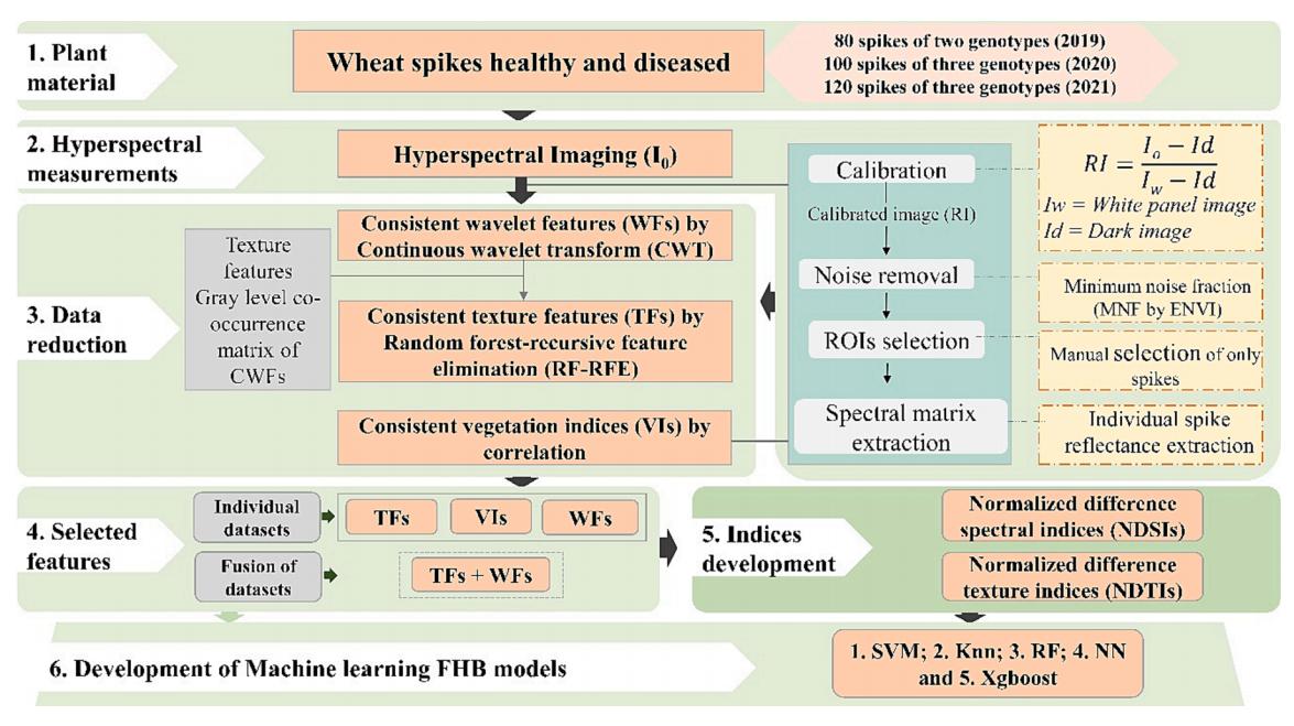 研究總體技術(shù)路線如圖2所示:基于時(shí)序病害高光譜影像,利用連續(xù)小波變換進(jìn)行特征選擇,包括小波特征(WF)和紋理特征(TF);同時(shí),還創(chuàng)建了赤霉病監(jiān)測(cè)新型指數(shù)(WFSI和WTTI),再利用多種機(jī)器學(xué)習(xí)算法逐一將WF、TF和數(shù)據(jù)融合(DF=WFs+TFs)作為輸入進(jìn)行赤霉病識(shí)別,最終確定赤霉病估測(cè)模型。