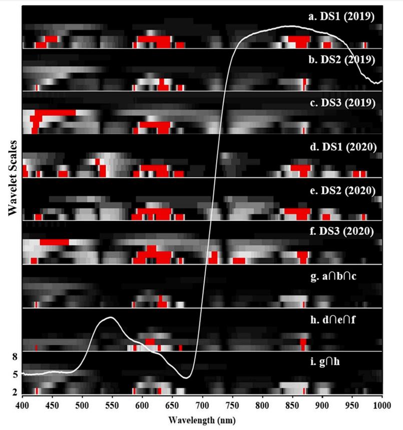 圖3. 2019年(a-c)和2020年(d-f)小麥赤霉病的小波系數(shù)相關(guān)標(biāo)度圖