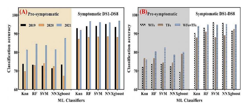 研究結(jié)果表明,赤霉病最顯著的小波特征在可見(jiàn)光區(qū)域的波段為420-440nm和580-680nm、近紅外區(qū)域?yàn)?50-880nm、920-940nm和980nm(圖3)。然而針對(duì)不同的病害階段,敏感小波特征有所差異,最終確定了赤霉病監(jiān)測(cè)小波特征為2尺度下的423、581、624、865小波系數(shù)。同時(shí),基于灰度共生矩陣計(jì)算出這些小波特征的紋理特征,再經(jīng)過(guò)任意兩兩組合,篩選出了四個(gè)赤霉病監(jiān)測(cè)新型指數(shù)(WFSI1、WFSI2、WFTI1、WFTI2)。經(jīng)過(guò)與傳統(tǒng)植被指數(shù)對(duì)比發(fā)現(xiàn),新型赤霉病監(jiān)測(cè)指數(shù)具有更好監(jiān)測(cè)能力,病害階段1和2的三年平均分類精度(ACA)分別是80%、90%和91%(圖4)。然而,將光譜指數(shù)和紋理指數(shù)一起作為輸入,小麥赤霉病的分類精度得到了進(jìn)一步提升,三年ACA分別提高到98.06%、89.67%和94.83%。對(duì)比不同的機(jī)器學(xué)習(xí)算法發(fā)現(xiàn),Xgboost展現(xiàn)出更好的穩(wěn)定性和準(zhǔn)確性(圖5)。這項(xiàng)工作揭示了高光譜成像技術(shù)在小麥赤霉病早期監(jiān)測(cè)上的巨大潛力,也為作物病害監(jiān)測(cè)提供了較好的參考。