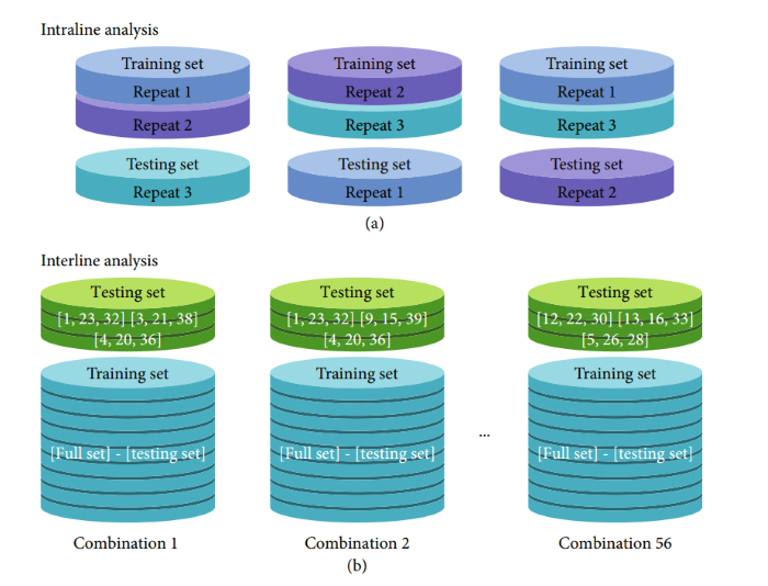 圖3:模型建立的樣本組合。圖中展示了用于品系內(nèi)分析(a)和品系間分析(b)的重復(fù)樣本和品種排列的示意圖