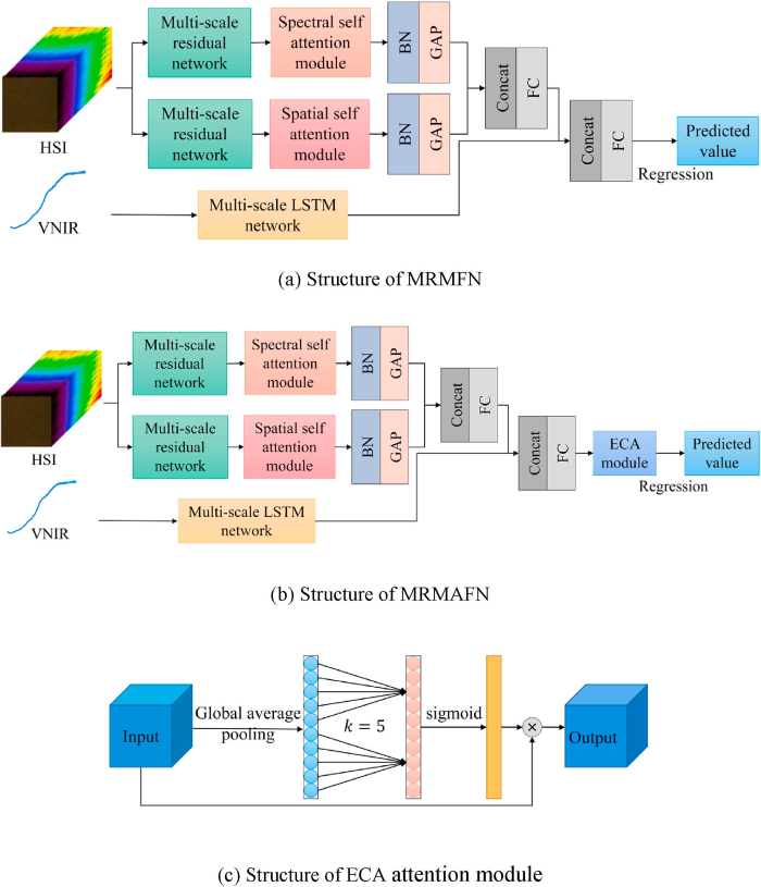 基于注意機制的多源數(shù)據(jù)融合網(wǎng)絡(luò)采用三分支結(jié)構(gòu),其中兩個分支用于提取HSI的空間與光譜特征,另一個分支用于提取VNIR的特征,并通過注意力機制實現(xiàn)多源信息的深度融合。該融合網(wǎng)絡(luò)由三種核心模塊構(gòu)成,分別是多尺度殘差網(wǎng)絡(luò)(MSRN,圖1(a))、多尺度長短期記憶網(wǎng)絡(luò)(MSLSTM,圖1(b))和自注意機制網(wǎng)絡(luò)(Self-attention Network,圖1(c)),同時設(shè)計了空間自注意模塊(其結(jié)構(gòu)如圖1(d)所示),以充分挖掘HSI圖像中的空間相關(guān)性與局部信息。針對土壤碳含量的高精度預測,本文設(shè)計了兩種創(chuàng)新性多源數(shù)據(jù)融合網(wǎng)絡(luò):具有空間和光譜自注意機制的多尺度殘差多源數(shù)據(jù)融合網(wǎng)絡(luò)(MRMFN)和具有增強型注意機制的多尺度殘差多源數(shù)據(jù)融合網(wǎng)絡(luò)(MRMAFN)。MRMFN和MRMAFN均通過引入ECA(Efficient Channel Attention)注意模塊,在捕捉全局特征的同時強化了通道間重要信息的提取。MRMFN、MRMAFN及ECA模塊的整體結(jié)構(gòu)如圖2所示。