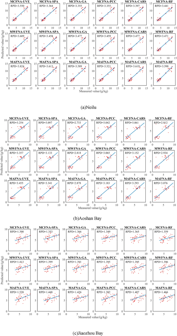 本文以內(nèi)陸、鰲山灣和膠州灣土壤樣品的VNIR和HSI多源數(shù)據(jù)為例,提出了關(guān)注機制下的多源數(shù)據(jù)融合網(wǎng)絡(luò)和人工特征下的多源數(shù)據(jù)融合網(wǎng)絡(luò),對3個樣地的土壤碳含量進行預測。注意機制下的多源數(shù)據(jù)融合網(wǎng)絡(luò)包括MRMFN和MRMAFN。具有人工特征的多源數(shù)據(jù)融合網(wǎng)絡(luò)包括MCFNA、MWFNA和MAFNA。在關(guān)注機制下的多源數(shù)據(jù)融合網(wǎng)絡(luò)預測結(jié)果中,與單源數(shù)據(jù)相比,基于MRMFN和MRMAFN的土壤碳含量預測精度有所提高,其中MRMAFN的預測精度最高。在具有人工特征的多源數(shù)據(jù)融合網(wǎng)絡(luò)預測結(jié)果中,采用MCFNA、MWFNA和MAFNA方法,進一步提高了3個樣地土壤碳含量的預測精度。3個樣地的碳含量預測精度由高到低依次為MAFNA、MWFNA、MCFNA,結(jié)合UVE人工特征預測精度最高。人工特征的多源數(shù)據(jù)融合網(wǎng)絡(luò)可以有效提高土壤碳含量的預測精度。與光譜數(shù)據(jù)和高光譜圖像兩種單源數(shù)據(jù)相比,基于多源數(shù)據(jù)融合網(wǎng)絡(luò)結(jié)合人工特征的內(nèi)魯、敖山灣和膠州灣的RPD分別提高了56.81%和149.18%、24.28%和43.96%、31.16%和28.73%。本研究可有效解決VNIR和HSI在土壤碳含量預測中多個特征深度融合的問題,從而提高土壤碳含量預測的準確性和穩(wěn)定性,促進土壤碳含量預測在VNIR和HSI中的應(yīng)用和發(fā)展,為碳循環(huán)和碳匯研究提供技術(shù)支持。促進生態(tài)系統(tǒng)碳收支更科學的模擬和更準確的預測。