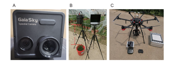 圖1.數(shù)據(jù)采集設(shè)備。A. GaiaSky mini2 VN相機(jī) B. 地面數(shù)據(jù)采集設(shè)備C. 無人機(jī)(UAV)數(shù)據(jù)采集設(shè)備
