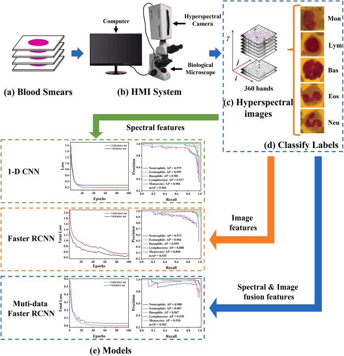 圖1. 主要研究流程圖:(a) 血涂片;(b) 高光譜成像系統(tǒng)(HMI);(c) 高光譜圖像;(d) 分類標(biāo)簽;(e) 模型與結(jié)果。
