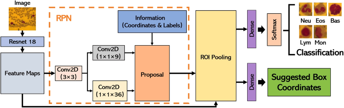 針對(duì)白細(xì)胞高光譜圖像的特征檢測(cè),本研究構(gòu)建了基于Faster RCNN的檢測(cè)框架。作為Fast RCNN的改進(jìn)版本,該框架結(jié)構(gòu)如圖3所示,通過二維卷積層(2D-Conv)、最大池化層(Max Pooling)和全連接層(Dense)實(shí)現(xiàn)白細(xì)胞的特征提取、定位與分類。其中,特征提取網(wǎng)絡(luò)采用Resnet18架構(gòu),該網(wǎng)絡(luò)能實(shí)現(xiàn)更深層次的特征提取,顯著提升白細(xì)胞類別間差異不明顯數(shù)據(jù)的識(shí)別精度。Faster RCNN的核心優(yōu)勢(shì)在于其區(qū)域提議網(wǎng)絡(luò)(RPN),該網(wǎng)絡(luò)能大幅提升白細(xì)胞等微小目標(biāo)的檢測(cè)能力。