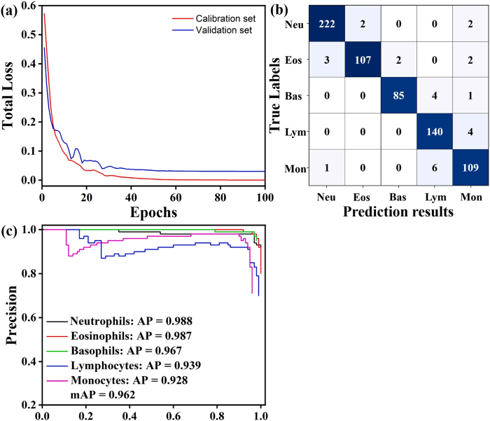 圖6. 多數(shù)據(jù)Faster R-CNN的結(jié)果:(a) 訓(xùn)練過程中的總損失曲線;(b) 分類結(jié)果的混淆矩陣;(c) 每個(gè)分類的精確率-召回率(PR)曲線。