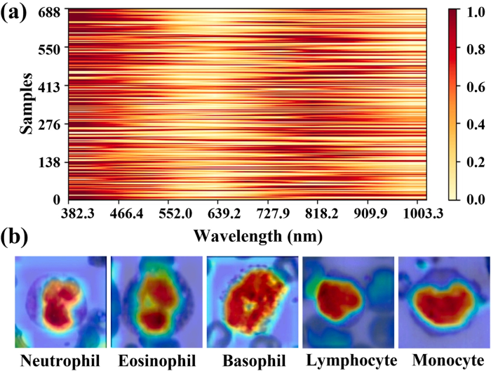 圖7. 多數(shù)據(jù)Faster R-CNN在預(yù)測(cè)集中生成的Grad-CAM:(a) 基于光譜波長;(b) 白細(xì)胞的圖像。