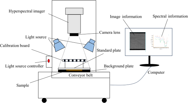 本研究中使用的高光譜成像系統(tǒng)是由江蘇雙利合譜科技有限公司設(shè)計和開發(fā)的GaiaSorter-Dual全波段高光譜成像系統(tǒng),如圖1所示。該成像系統(tǒng)采用推掃式(push-broom)成像方式,光譜范圍為920.8–2528.6納米,光譜分辨率為5.7納米,有效狹縫長度為9.6毫米,狹縫寬度為30微米,包含256個光譜通道,像素尺寸為30×30微米。圖像采集速度設(shè)置為3厘米/秒,曝光時間為6毫秒,幀率為70赫茲。