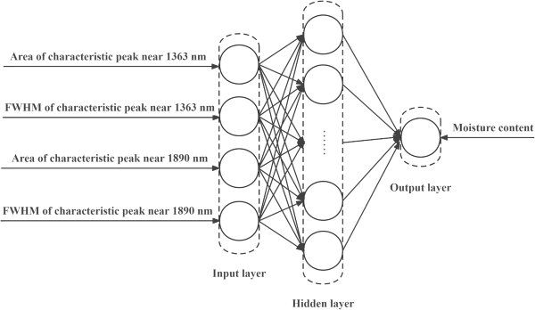 在模型建立方面,基于BP神經(jīng)網(wǎng)絡(luò)檢測聚酯織物的水分含量,BP神經(jīng)網(wǎng)絡(luò)的整體結(jié)構(gòu)如圖2所示。