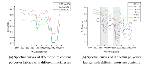 在本研究中,通過高光譜成像系統(tǒng)獲取了150組不同規(guī)格和不同水分含量的聚酯織物的高光譜圖像。在本節(jié)中,我們對三種不同厚度條件下不同水分含量的聚酯織物的光譜曲線進行了特征分析,并研究了這些光譜曲線之間的形態(tài)差異。這些聚酯織物的光譜曲線如圖3所示。