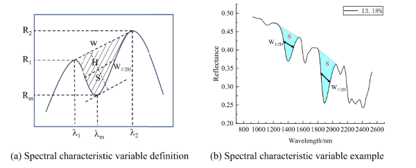 由于多種因素的影響,例如外部光照強度、高光譜系統(tǒng)相機的暗電流以及其他來源,采集到的高光譜圖像信息可能包含大量噪聲信號。因此,在獲取聚酯織物的光譜圖像之前,在實驗環(huán)境中采集標(biāo)準(zhǔn)板和背景板的光譜圖像,以校正聚酯織物光譜圖像的反射率。此外采用多散射校正(MSC)、標(biāo)準(zhǔn)正態(tài)變量(SNV)以及一階導(dǎo)數(shù)預(yù)處理方法消除基線漂移等因素對光譜曲線的干擾。采用半高全寬(FWHM)評估和篩選水分相關(guān)的有效波段,F(xiàn)WHM是用來衡量高光譜數(shù)據(jù)中特征吸收峰寬度的重要參數(shù)之一,反映了譜線的分布范圍和吸收強度變化的銳利程度。