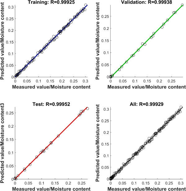 當(dāng)模型同時使用1363 nm和1890 nm兩個特征峰的面積和半高寬(FWHM)作為光譜特征變量時,訓(xùn)練集、驗證集和測試集的MSE值均低于0.0015%,表明模型整體誤差較小。測試集的相關(guān)系數(shù)(R值)達到0.99952,MSE為0.00090%(RMSE為0.2998%,即測試集中水分含量的預(yù)測誤差約為0.2998 wt%)。MSE與R值綜合表明,使用1363 nm和1890 nm特征峰的面積和FWHM作為光譜特征變量構(gòu)建的模型具有極佳的性能。其相關(guān)性強(R值大于0.999),誤差低(MSE小于0.0015%,RMSE小于0.3873%),顯示該模型預(yù)測精度高??傮w而言,在以1890 nm單一變量建模的基礎(chǔ)上,進一步引入1363 nm特征峰的面積和FWHM可進一步提高相關(guān)性并降低誤差。