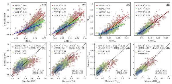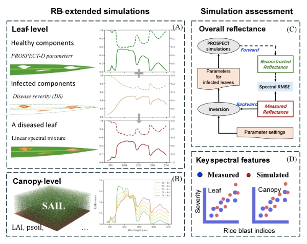 本研究首次提出了 “病害擴(kuò)展PROSAIL模型(RB-extended PROSAIL)”,將稻瘟病感染程度(Disease Severity, DS)作為新的參數(shù)引入輻射傳輸模擬中。研究團(tuán)隊(duì)通過(guò)實(shí)測(cè)病斑光譜與模型混合分析,成功構(gòu)建了稻瘟病葉片與冠層的光譜仿真數(shù)據(jù)集,能夠在不受物候差異影響的條件下區(qū)分病害信號(hào)。